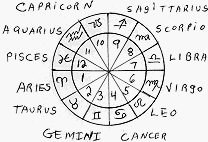 ![]() | Note on the left of the inner wheel is the number "1". In the outer wheel is the symbol for Aries.On the outside of the wheel is the word Aries. The name and symbol of each sign proceeds in order around the wheel. |
