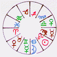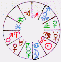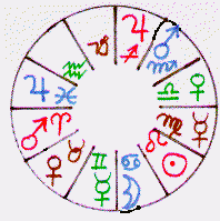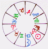 ![]() | To the left we have a wheel with the Moon shown in the sign Cancer. The Sun is shown in the Sign Leo. These are rulership signs for the two 'lights'. |